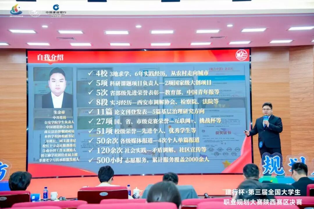 校赛选拔中,在辅导员崔逸霏的指导下,朱金帝以研究生就业赛道第一名的优异成绩脱颖而出,成功拿到省赛入场券。在决赛现场,朱金帝结合公安学院的专业特色与个人优势,通过对职业目标的精准定位、对行业发展深刻的理解以及对未来路径的合理规划,向评委们阐述了将个人理想融入国家法治建设需求的职业愿景,现赢得评委的高度评价,最终斩获银奖。