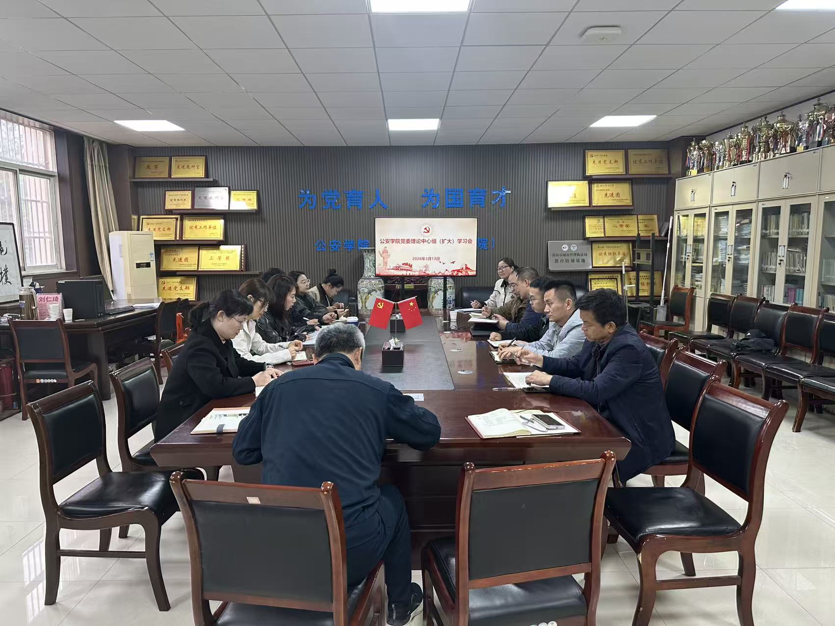 为深入学习贯彻全国两会精神,3月13日下午,公安学院党委召开理论学习中心组(扩大)学习会议。学院党委理论学习中心组成员、师生党支部书记、科级干部参加学习。学院党委书记上官亚敏主持。